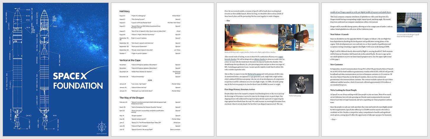 After SpaceX was founded in 2002, Elon (and later others in the company) published regular updates to their mailing list describing in detail what the company was working on and how they made progress. From 2003 to 2013 there were 100+ updates released that make an astounding case study and “real-time” history of early SpaceX and the technical and operational challenges they overcame.